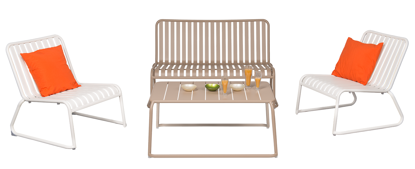 Créez un espace lounge coloré et extérieur, idéal pour vos terrasses VIP, grâce à notre collection de mobilier Moli. Son design en aluminium thermolaqué, empilable et léger, est parfait pour vos jardins, terrasses et intérieurs, offrant un grand confort. Ce mobilier d’extérieur se décline en chaise, tabouret, table haute, medium et basse, fauteuil et canapé. Disponible en 5 coloris : blanc, taupe, bleu turquoise, jaune moutarde et gris anthracite. N'hésitez pas à l'associer aux chaises extérieures Moli. Empilable et classé feu.